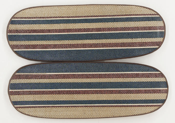 右近下駄の表面に色と素材を変え貼り分けたシコロ織りのクロスを貼ってあります。足跡が着きにくく丈夫な素材です。