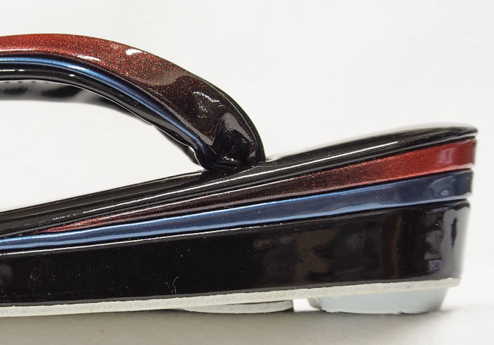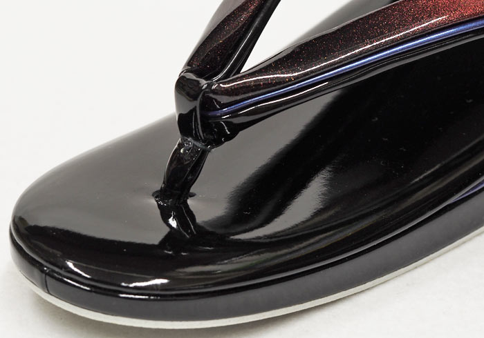 塗装仕上げの合成皮革ではなく、合成皮革製造時に顔料を混ぜて着色することで製造コストを抑えた、 造りが良い割にお求めやすい価格の草履です。鼻緒の上と踵の半月に点々とラメを散りばめた素材を使用しています。