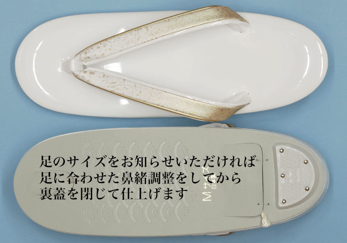 鼻緒の上と踵の半月にコーティングした帆布地に金銀を吹き付けた素材を使用しています。