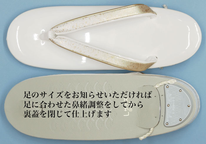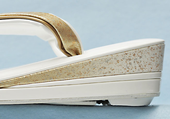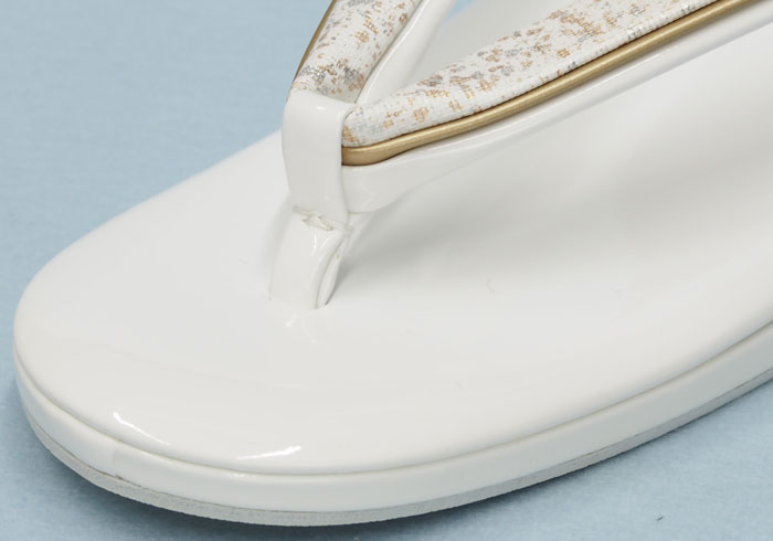 鼻緒の上と踵の半月にコーティングした帆布地に金銀を吹き付けた素材を使用しています。
