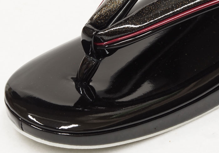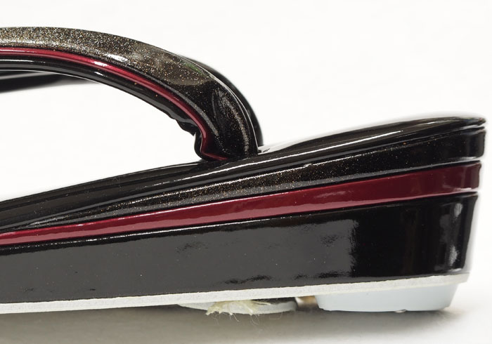 鼻緒の上と踵の半月にコーティングした帆布地に金銀を吹き付けた素材を使用しています。